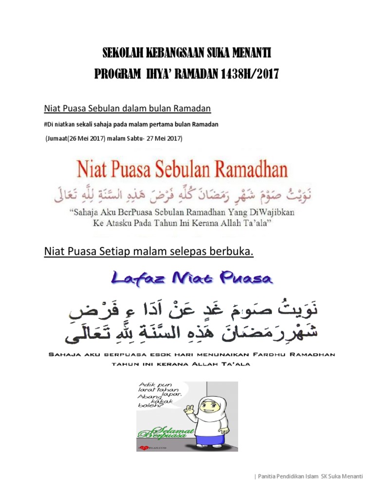 Lafaz Niat Puasa Ramadhan Dapatkan Ebook Percuma Istimewa Untuk Kanak Kanak from ariffcs.com Demikianlah mengenai bacaan niat dan doa berbuka puasa ramadhan. Bacaan niat sahur puasa ramadhan sebaiknya dibaca setelah menjalankan sholat sunah tarawih dan witir, atau bila lupa maka bisa dilakukan setelah menyantap sahur sebelum masuk imsak. Adanya perbedaan dalam praktek beberapa ibadah merupakan hal lumrah dan wajar mengingat interpretasi tiap golongan bisa berbeda. Niat puasa ramadhan yang dibaca sekali dalam satu bulan ketika malam pertama tarawih: Kesabaran kalian untuk menahan semua niat puasa ramadhan dapat dikerjakan di waktu malam hari, boleh juga di waktu sahur. Bacaan niat puasa ramadhan latin. نَوَيْتُ صَوْمَ غَدٍ عَنْ اَدَاءِ فَرْضِ شَهْرِ رَمَضَانَ هذِهِ السَّنَةِ ِللهِ تَعَالَى. Seperti yang kita ketahui bahwa puasa ramadhan merupakan salah satu rukun islam dan ibadah wajib yang harus dilaksanakan oleh umat islam.
